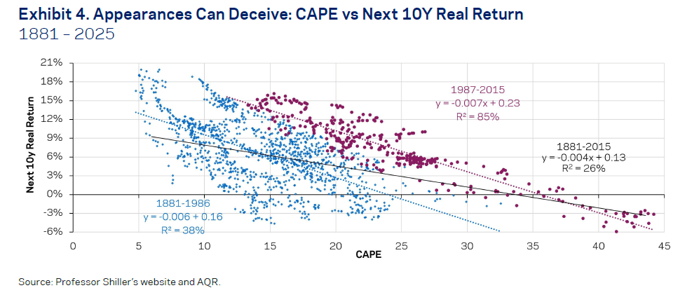 From 1881-2025 you can see an r2 of 26% that is pretty significant. However, if you look at 1987-20215 with the violet colouring the r2 is 85% meaning that the PE ratio explains 86% of the future 10 years returns.