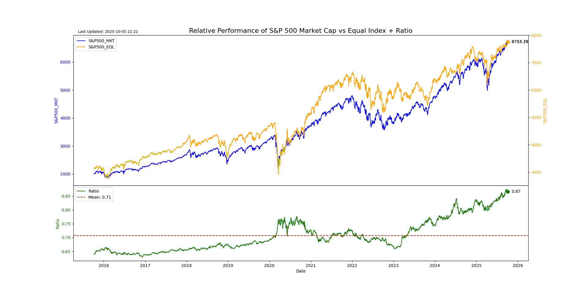 As we are constantly being told the bulk of the value of the S&P 500 market cap index, the one we are used to investing in, is dominated by a few technology heavyweight stocks. You can see by the green ratio button how the market cap index has accelerated relative to the equal weighted S&P 500 index.
