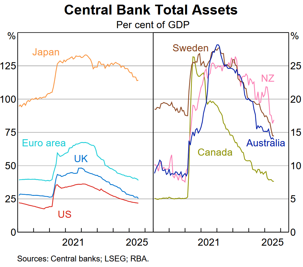 Yesterday I spotlighted the central banks’ quantitative tightening (QT) with light reference to the size of their balance sheets to their respective GDPs. Occasionally life serves you lemonade, and today quite by chance I stumbled on a chart by the Reserve Bank of Australia.