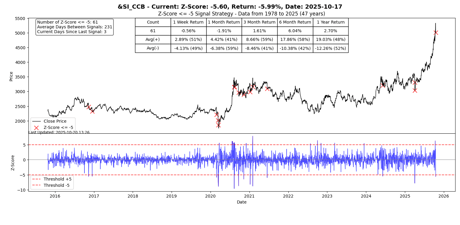 Platinum and silver had massive down days. Platinum produced its 8th -7 Z-score, and Silver its 61st -5 Z-score. If you believe in the myth that financial time series are normally distributed, those events should happen every 3 billion and 6,800 years, respectively.