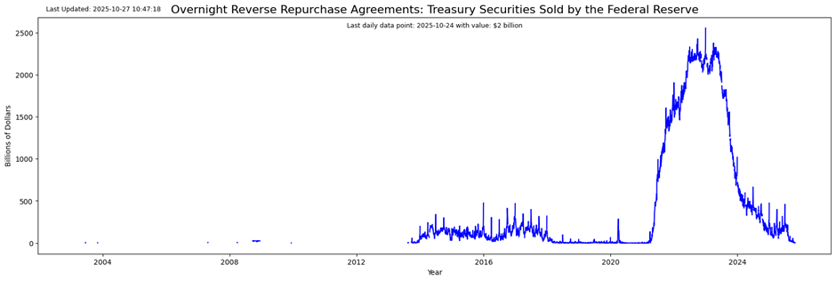 Economist Dr John Hussman one of my favourite thinkers, argues otherwise. He famously said, “There is no such thing as money going into or out of the market—only a change in who holds it.” His point is based on balance-sheet logic: for every buyer, there’s a seller; money never leaves the system, it merely changes hands. When money-market funds placed cash into the RRP, they simply swapped one claim (bank reserves) for another (a Fed reverse repo). Both are money-like assets. So, as the RRP drains, we are merely witnessing a swap of claims, not the creation of new money.