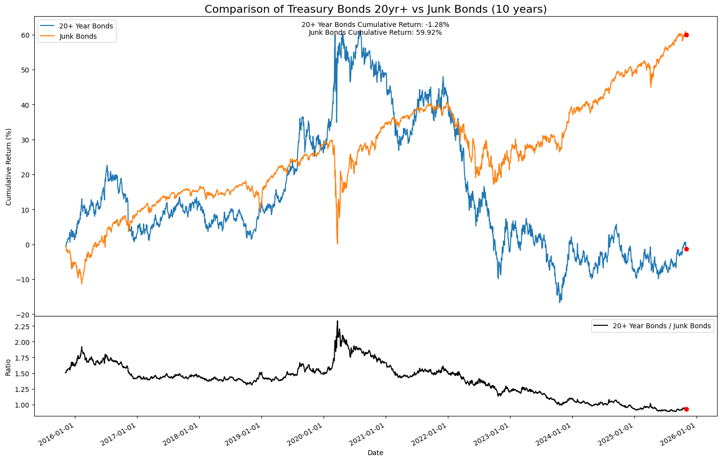 I believe junk bonds have been trading more like growth stocks than high-yield bonds. I therefore think the ratio in the chart below will soon start tracking up as junk sells off and long-term treasury bonds trade up on a relative basis. I have used ETFs JNK (Junk) and TLT (20yr+ Treasury bonds) to express the trade.