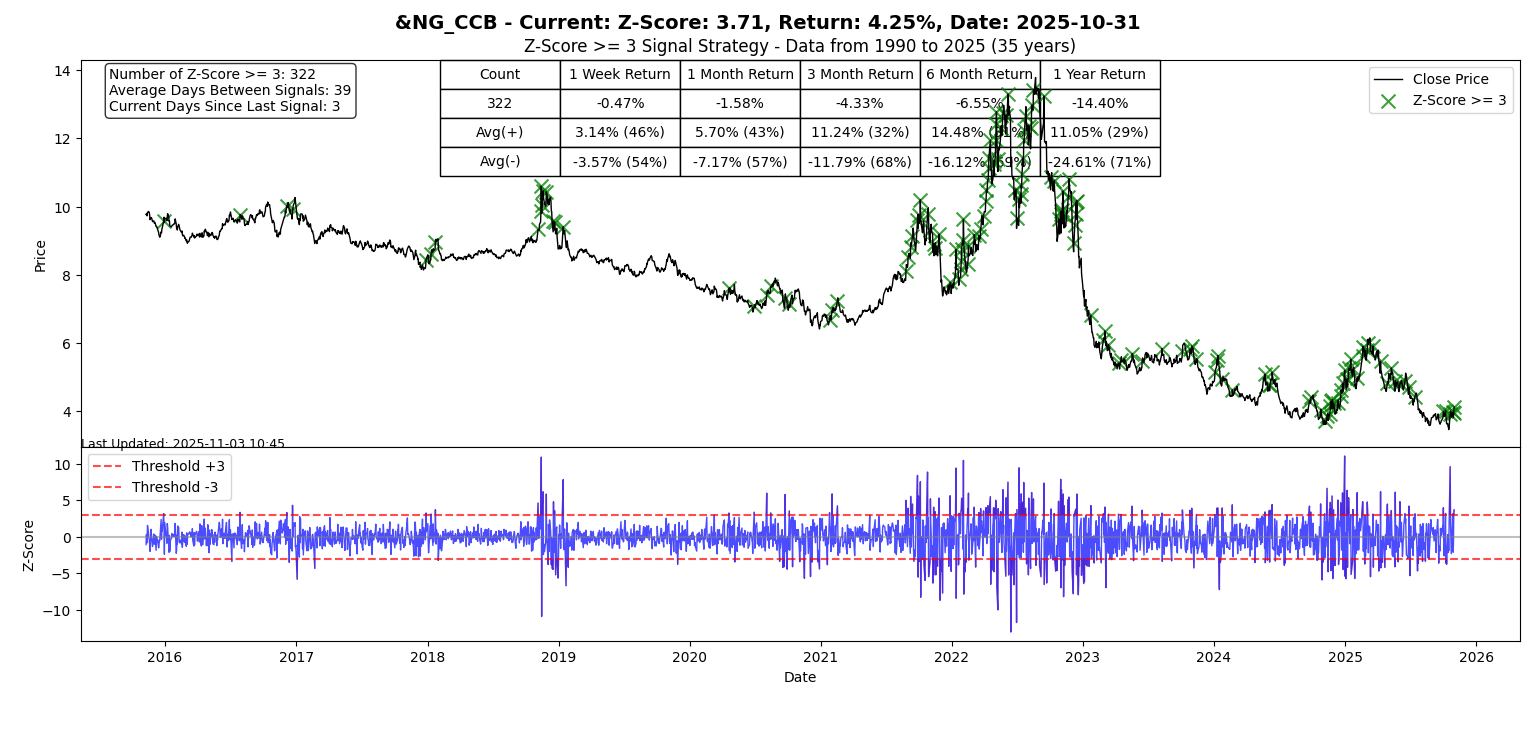 I honestly don’t know how you can trade natural gas these days. A three- sigma event is almost a daily occurrence. Yes, the obvious answer is to trade smaller, but an instrument that volatile is just difficult to handle. I should mention that I use an expanding lookback window for my Z score calculation, which means that I keep adding history to the calculation so that it is able to distinguish abnormal from normal.