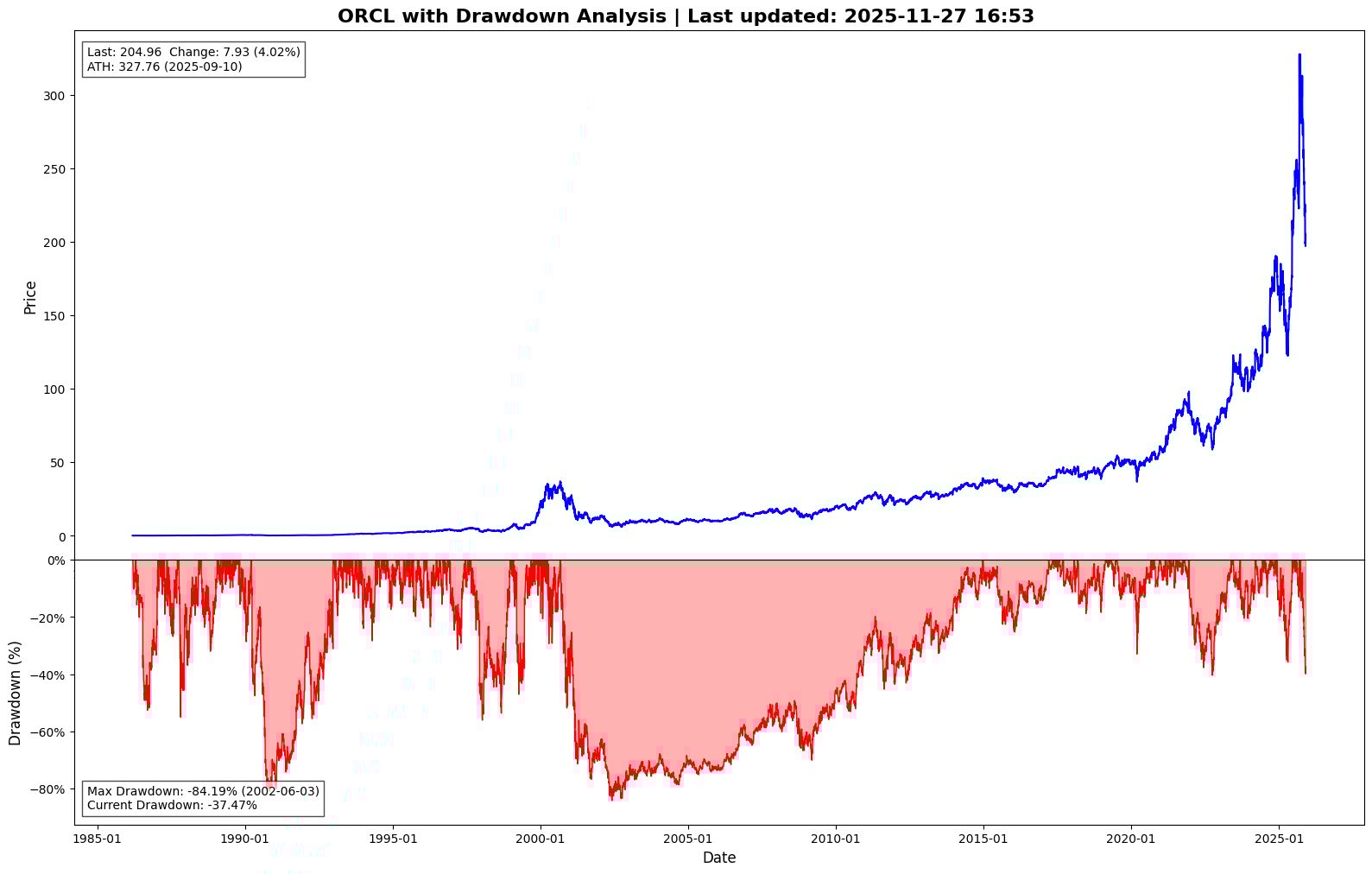 Oracle has enjoyed a dramatic AI price boom that has made Larry Ellison the second richest man in the world, almost out of nowhere. However, I cannot help but take notice of all the talk about Oracle and its ability to service its debt, which has triggered a 37% drawdown. Take a look at the second chart, which shows the cost of insuring against a default.