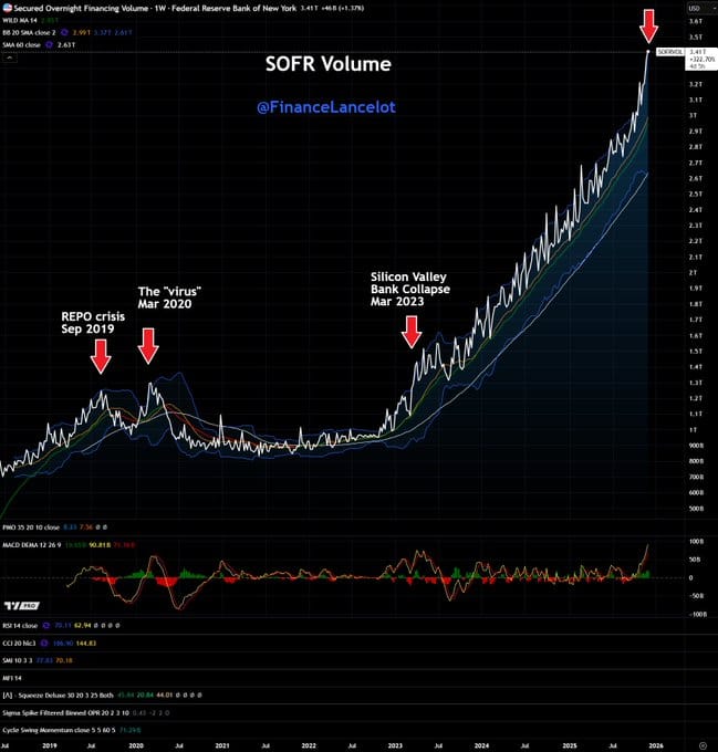When SOFR volumes break above $3 trillion. It tells you the modern financial system prefers the safety of overnight collateral to the risk of real investment. It tells you banks are screaming that they are only comfortable living one day at a time. I wonder why.