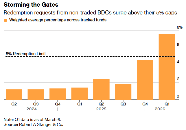 In a recent Bloomberg article, they discuss the fact that on Friday BlackRock halted withdrawals on their $26 billion fund at 5%. Other major players are experiencing similar redemption requests and are having to pause withdrawals. The chart below gives a clear visual on the increase in redemptions. Non-Traded Business Development Companies (BDCs) are just an industry name for how part of the industry is financially engineered.